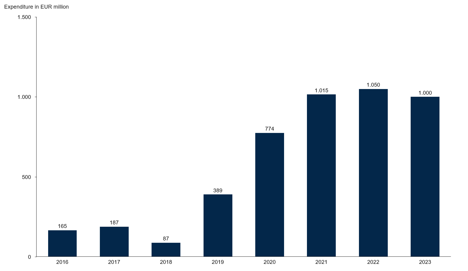 Figure 2: Federal public expenditure on digital infrastructure in Germany from 2016 to 2023, by type (in EUR million)